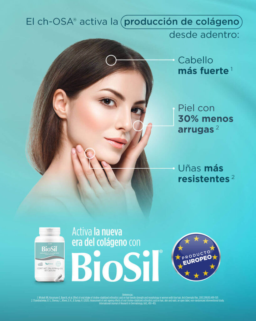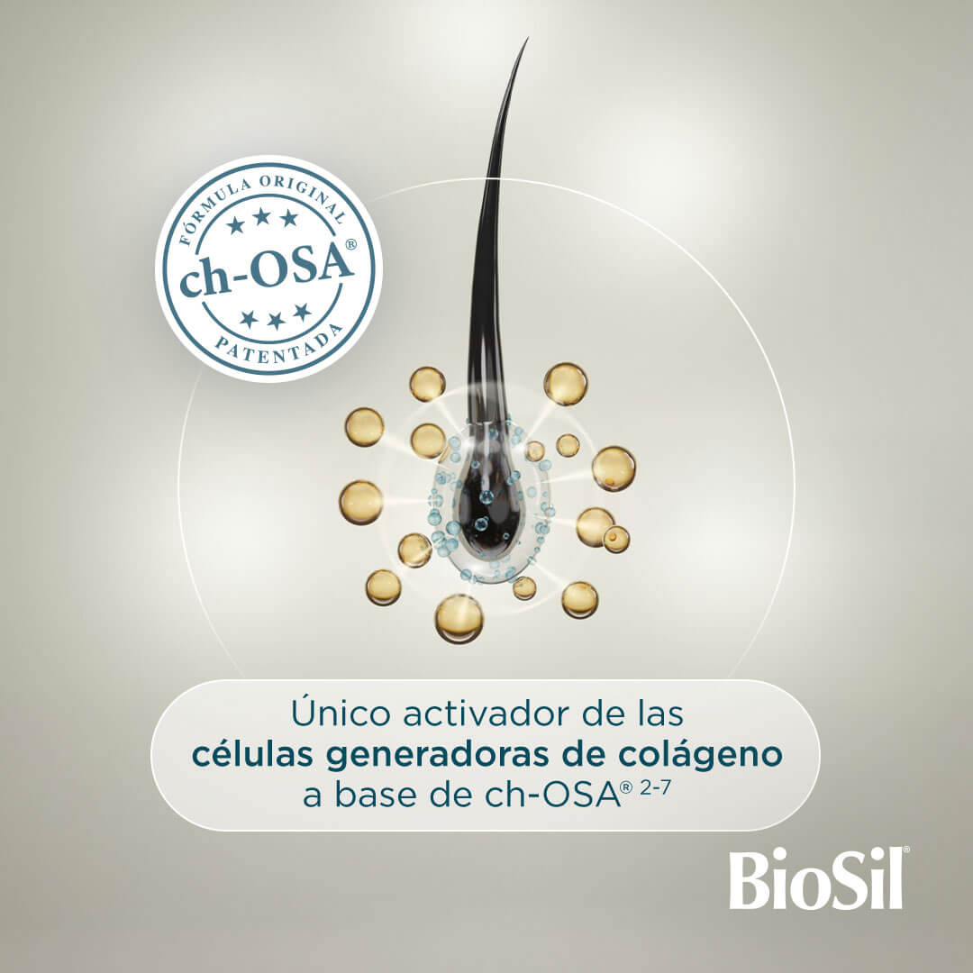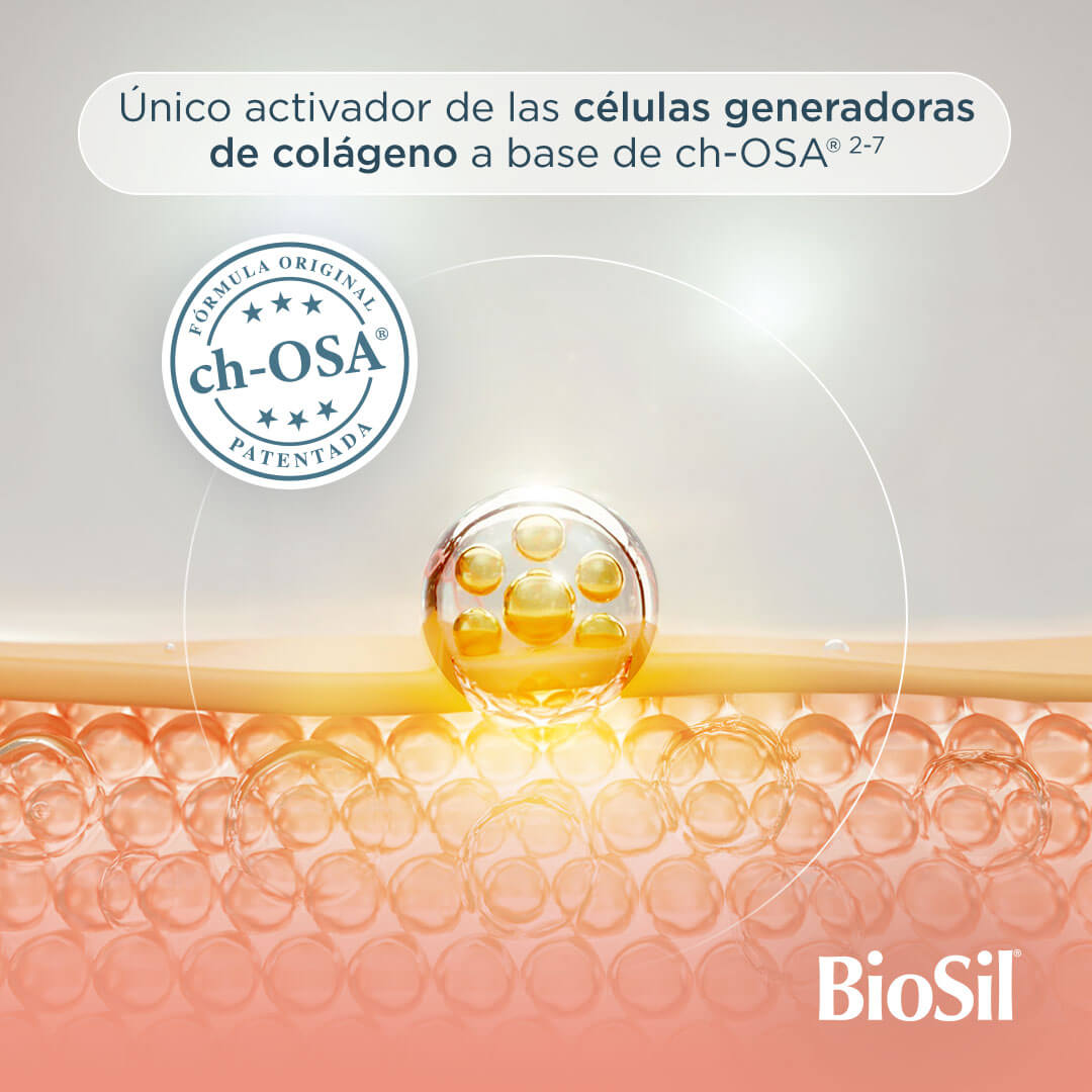 El ch-OSA®, presente en Biosil®, es un activador de las células generadoras de colágeno, clínicamente comprobado para: reducir líneas de expresión y arrugas, brindar fuerza y grosor al cabello, fortalecer las uñas, además de mantener huesos fuertes y flexibles y proteger las articulaciones.