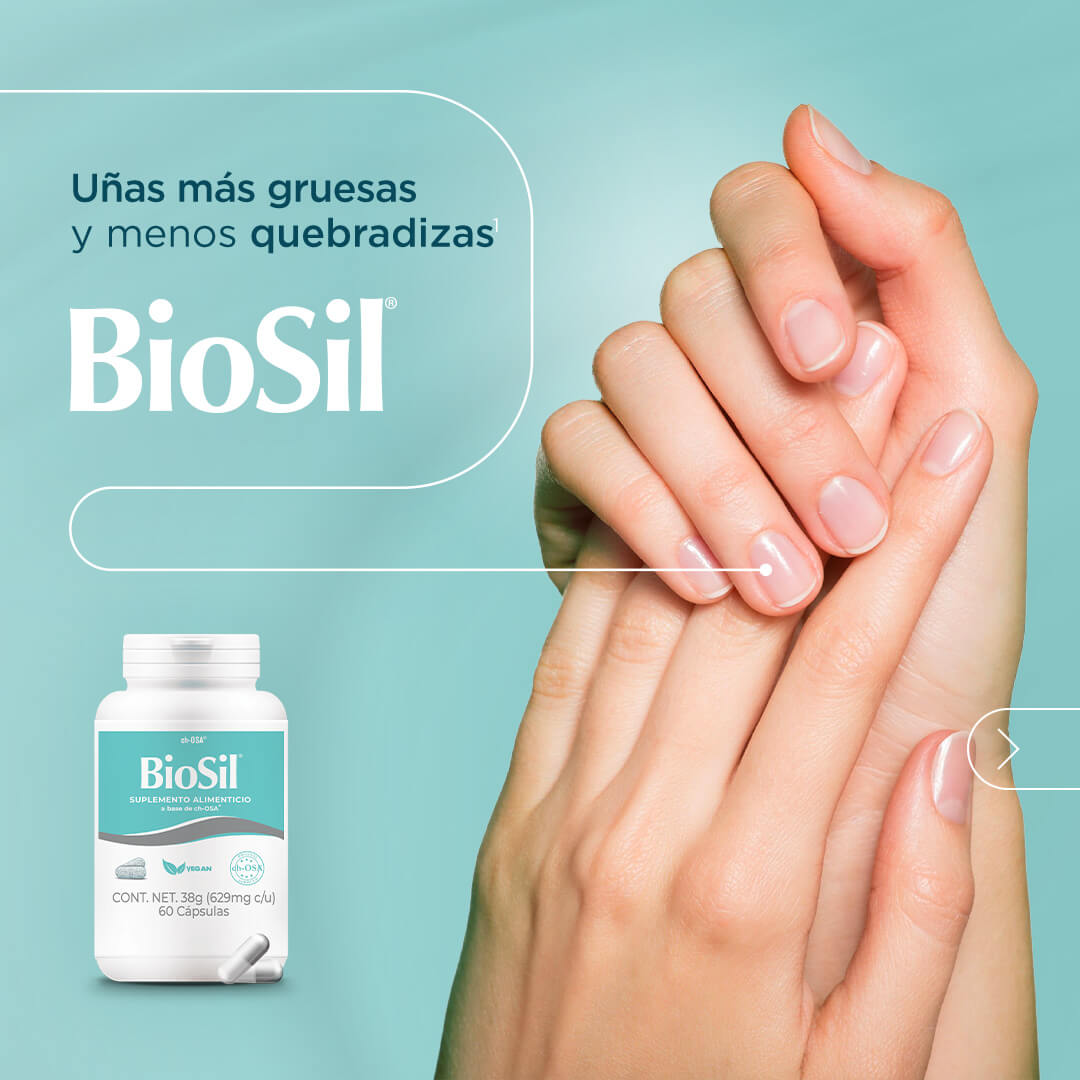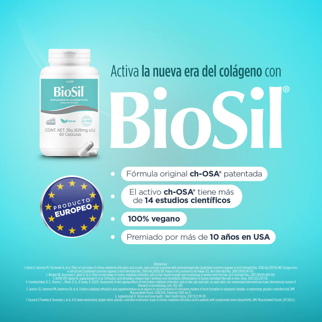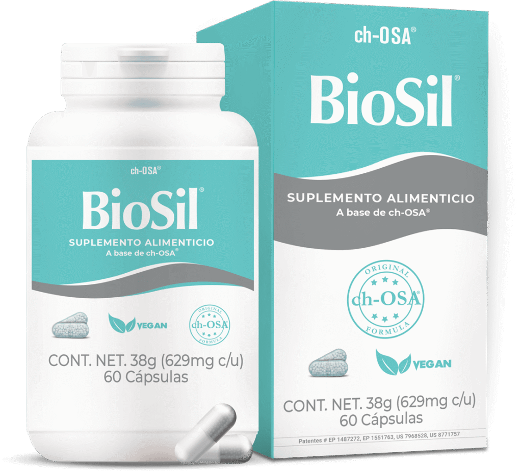 El ch-OSA®, presente en Biosil®, es un activador de las células generadoras de colágeno, clínicamente comprobado para: reducir líneas de expresión y arrugas, brindar fuerza y grosor al cabello, fortalecer las uñas, además de mantener huesos fuertes y flexibles y proteger las articulaciones.