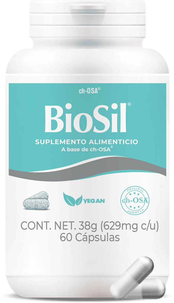 BioSil® es un suplemento alimenticio a base de ch-OSA® (ácido ortosilícico estabilizado con colina) de origen 100% europeo, en forma de cápsula vegana que reactiva las células de tu cuerpo a la producción de colágeno de forma natural siguiendo tu propio patrón de ADN
